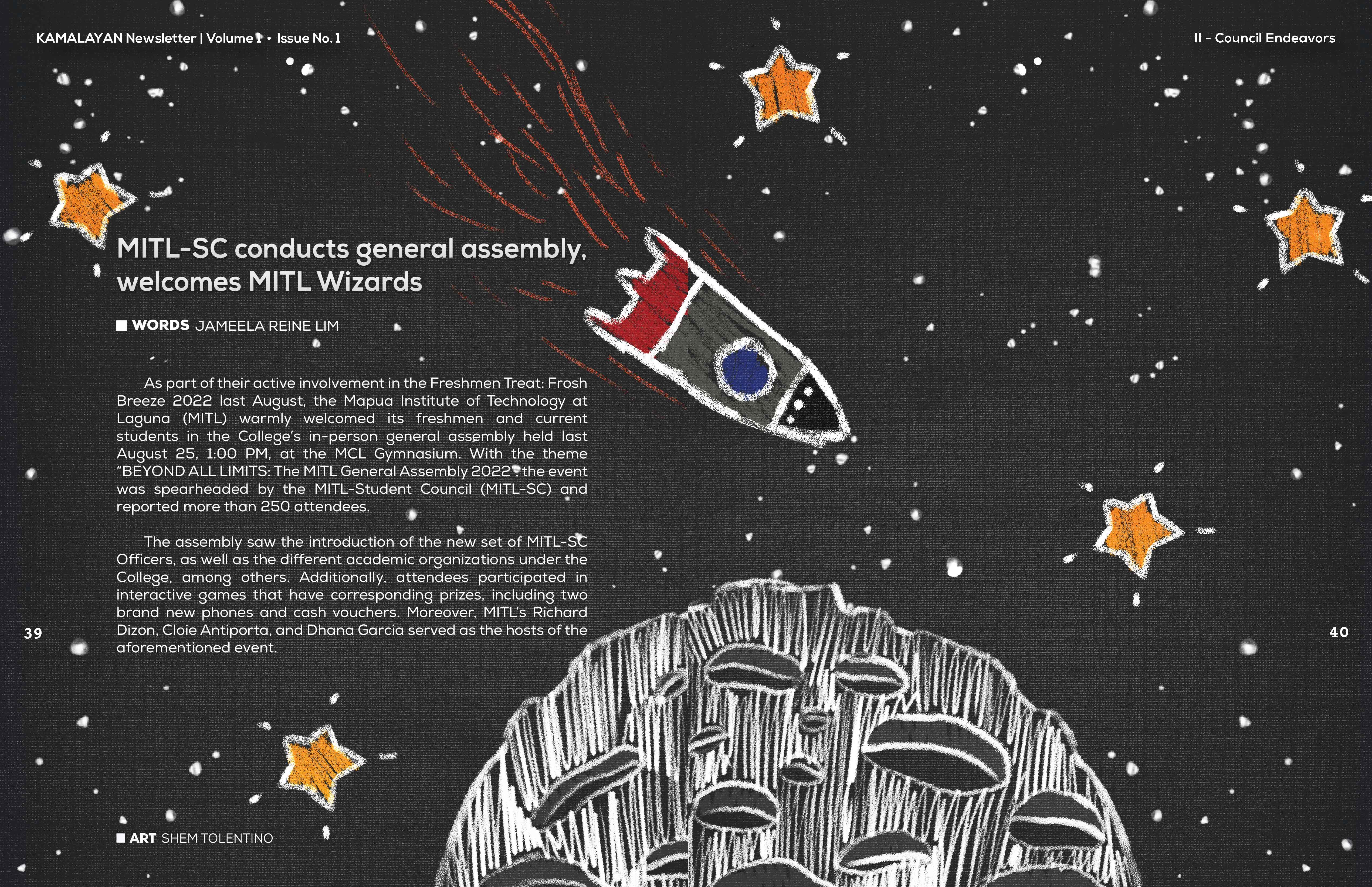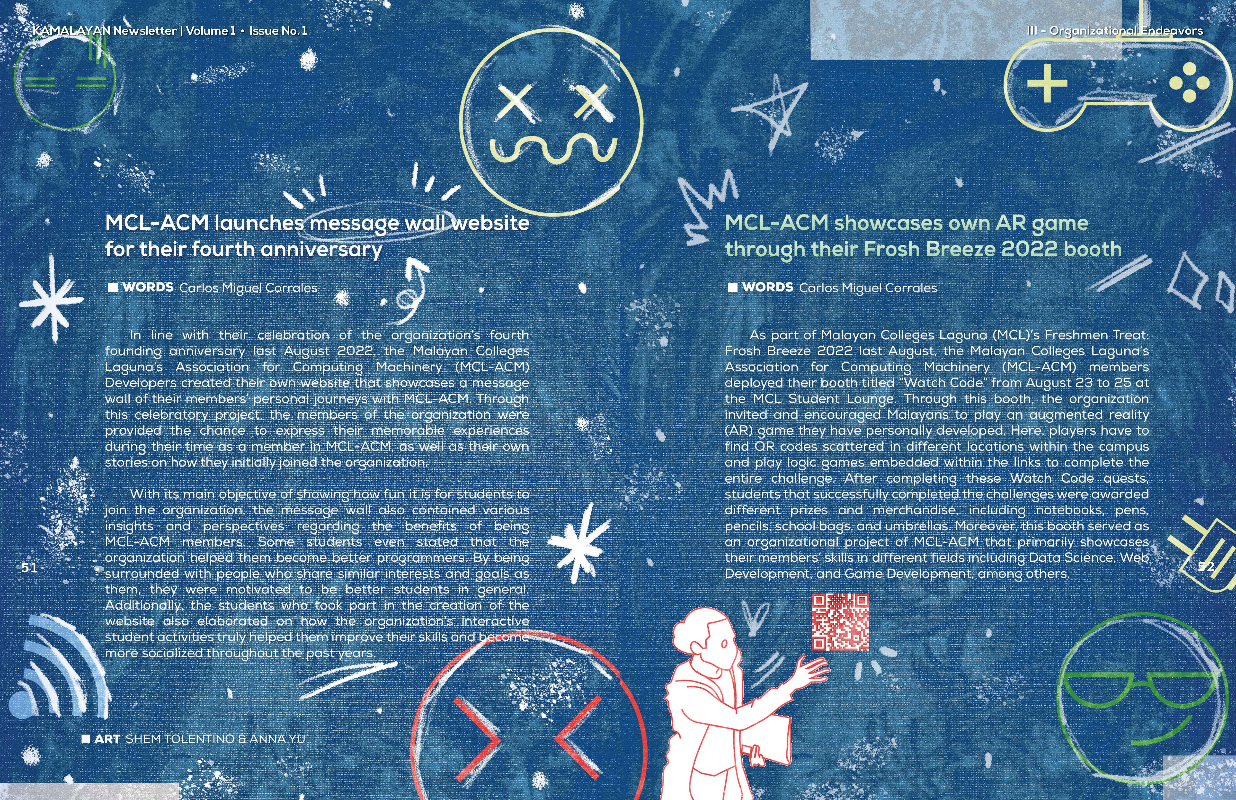 As the Art Director of the publication organization of Mapua MCL, KAMALAYAN, we've produced the first newsletter for the school year 2022 - 2023! I had the amazing opportunity to work closely with our artists and most especially our talented writers from the Print Department. We used Photoshop for the per page articles, and then used InDesign to compile all of the articles together. Our lead artist for this project is Su Lin Basbas, and we worked closely on how we would be able to construct the first newsletter of KAMALAYAN. I was in charge of facilitating the progress of our department, guiding our artists towards good outputs, reviewing their drafts, offering revisions and points of improvement in their illustrations and layouts.