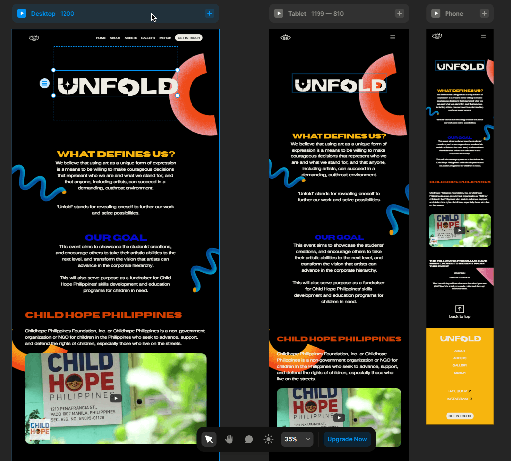 Amazing opportunity to work with Pau Chavez, Nikki Buño, Aldrich Pajarillo, and Marcus Tayas in the conception of the website for our event, UNFOLD 2023. I was the exhibit executive of the team, and took charge mostly in the UX part of the website conception. We first brainstormed how the website will look like in Canva and Figma, and then from Figma we brought the design to Framer. The website is then published on Framer.